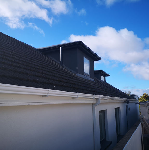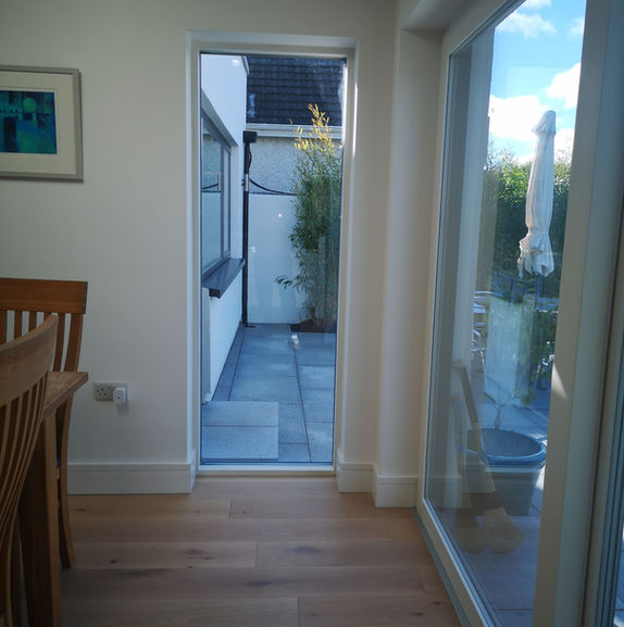 Complete refurbishment of an existing detached house that achieved an A1 energy upgrade. We created a courtyard to the front with a rendered wall with chamfered openings. As you enter the house, you're greeted with a large frameless roof window that fills the hall with natural light. The existing garage room was conveted into an office and cloackroom storage.